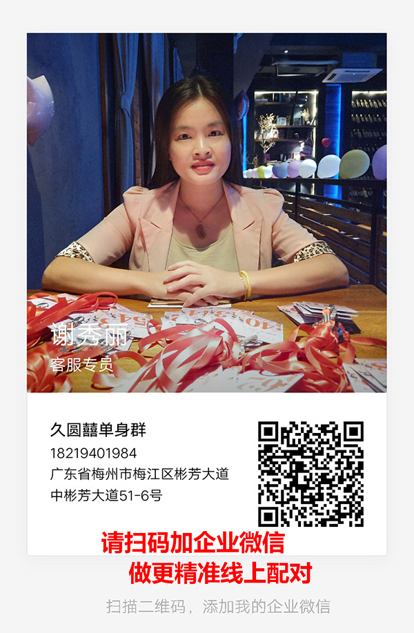 久圆囍婚恋是广东婚恋连锁品牌,采用线上线下相结合的服务模式,竭诚为单身人士提供专业婚恋交友服务。我们提供线上自主交友、线下老师一对一服务,线下组织单身派对,开展婚姻情感咨询等婚恋服务,帮助大家扩大单身社交圈子,精准匹配资源,助早日觅得良偶,促进社会和谐。